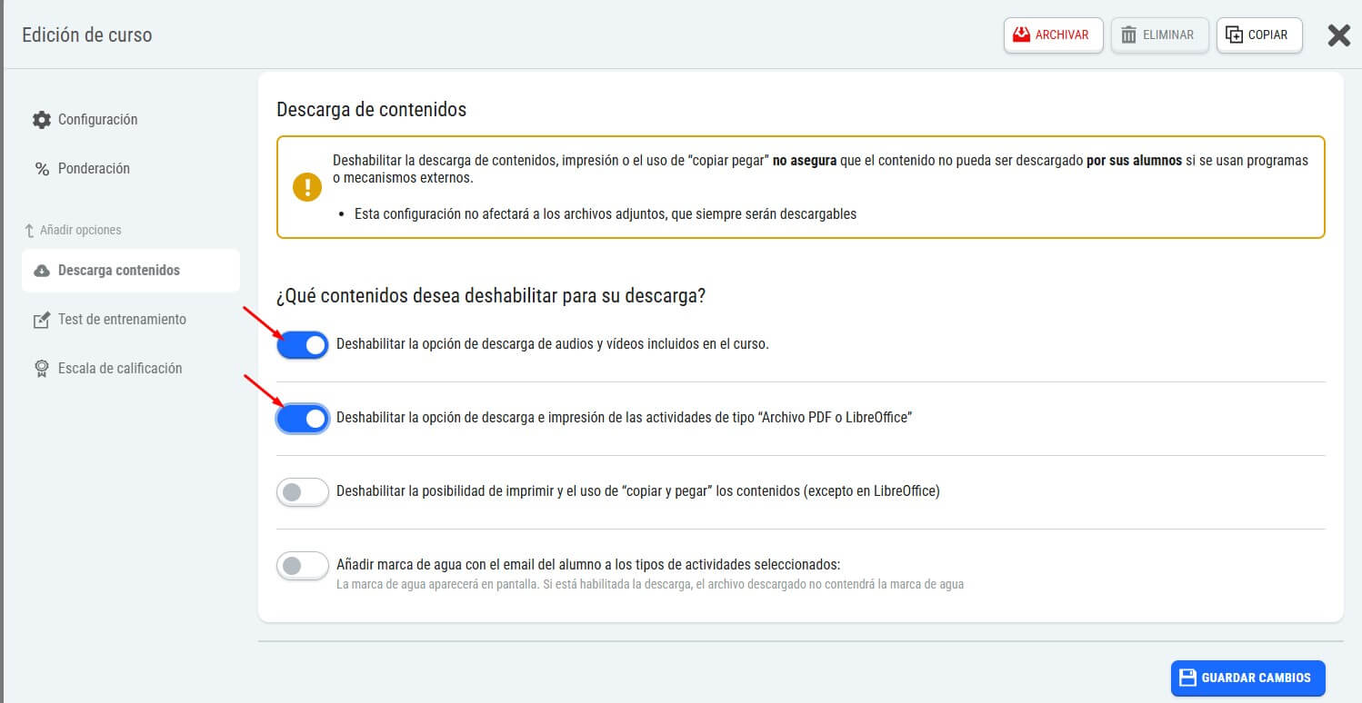 Desde la edición de Curso, en la herramienta 'Descarga contenidos' podemos deshabilitar la opción de descarga de contenidos del curso de tipo vídeo o audio, y PDFS o LibreOffice.