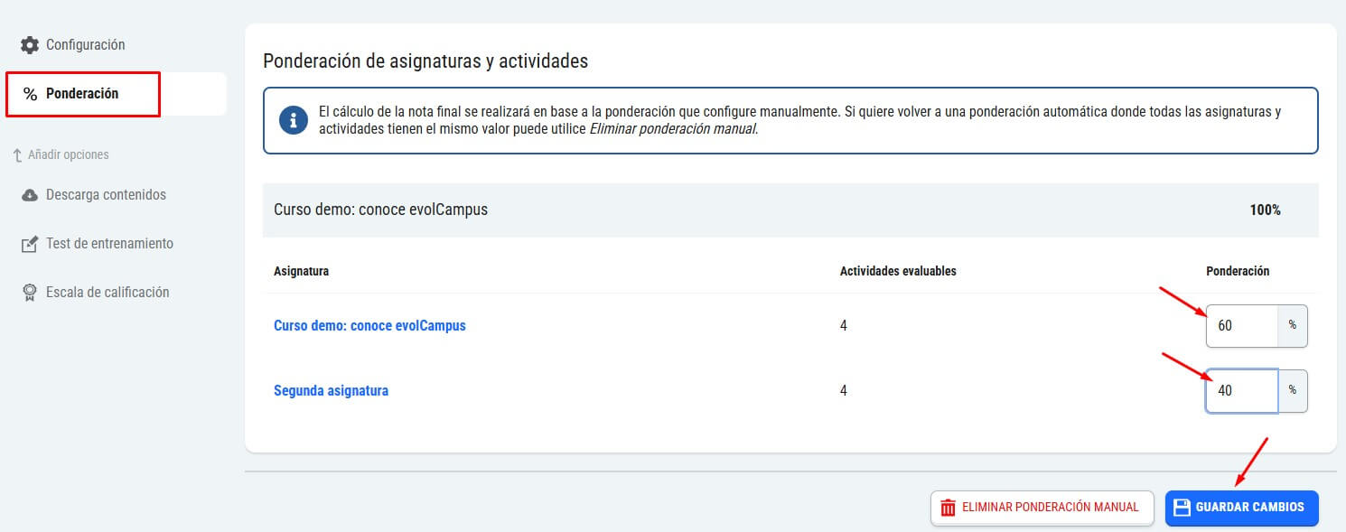 Por defecto la ponderación es automática, repartiéndose el peso proporcionalmente entre las asignaturas y actividades existentes en el curso.