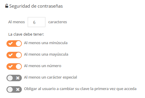 Actualmente, los requisitos mínimos de seguridad con los que deben contar las contraseñas de los usuarios son tener al menos 6 caracteres, 1 mayúscula, 1 minúscula y 1 número.