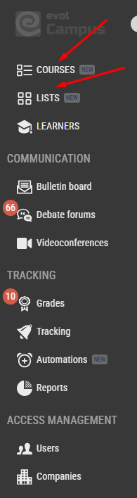 In case you have the lists of courses add-on enabled, we have integrated “Lists” directly into the main side menu, just below “Courses.” This allows you to jump between the two sections with a single click, without having to load a new page, saving time and making navigation more intuitive:
