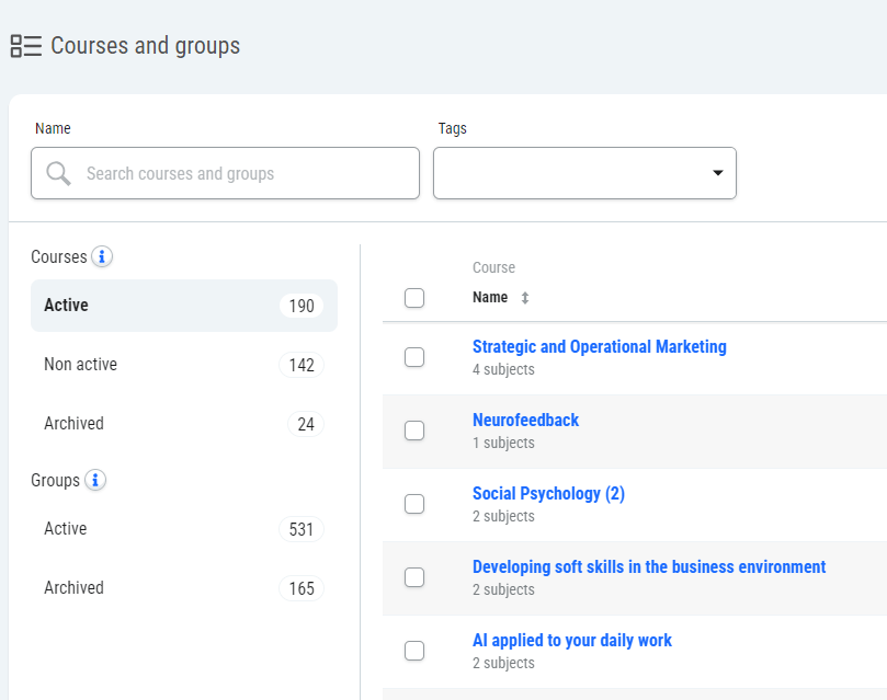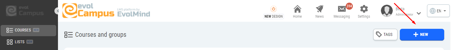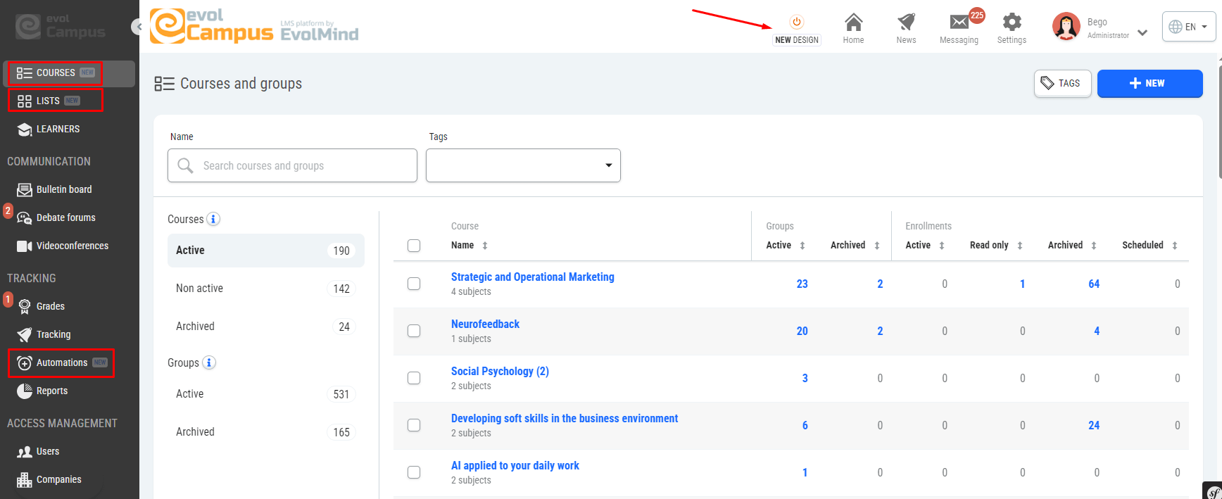 We've highlighted the “+ New” button in the upper right corner. It's now more visible and instantly accessible, allowing you to create courses or groups much faster, which is one of the most frequent actions: