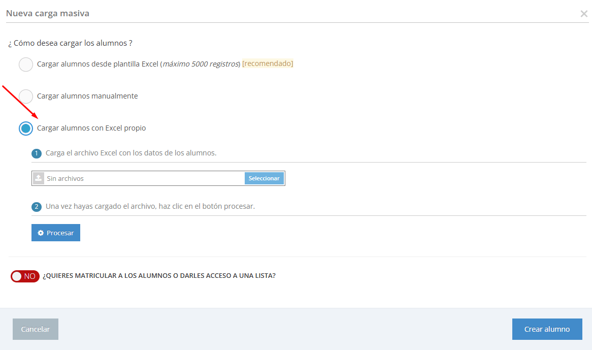 Al realizar una nueva carga masiva de alumnos en el campus, encontraréis la posibilidad de "Cargar alumnos con un Excel propio" donde hay que seguir dos simples pasos: