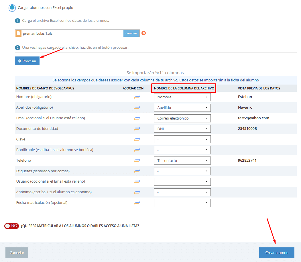 Matriculación de alumnos a través de Excel propio