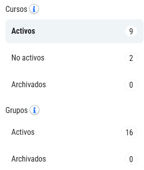 - No activos: cursos que no tienen ningún grupo, o que tienen todos sus grupos archivados.