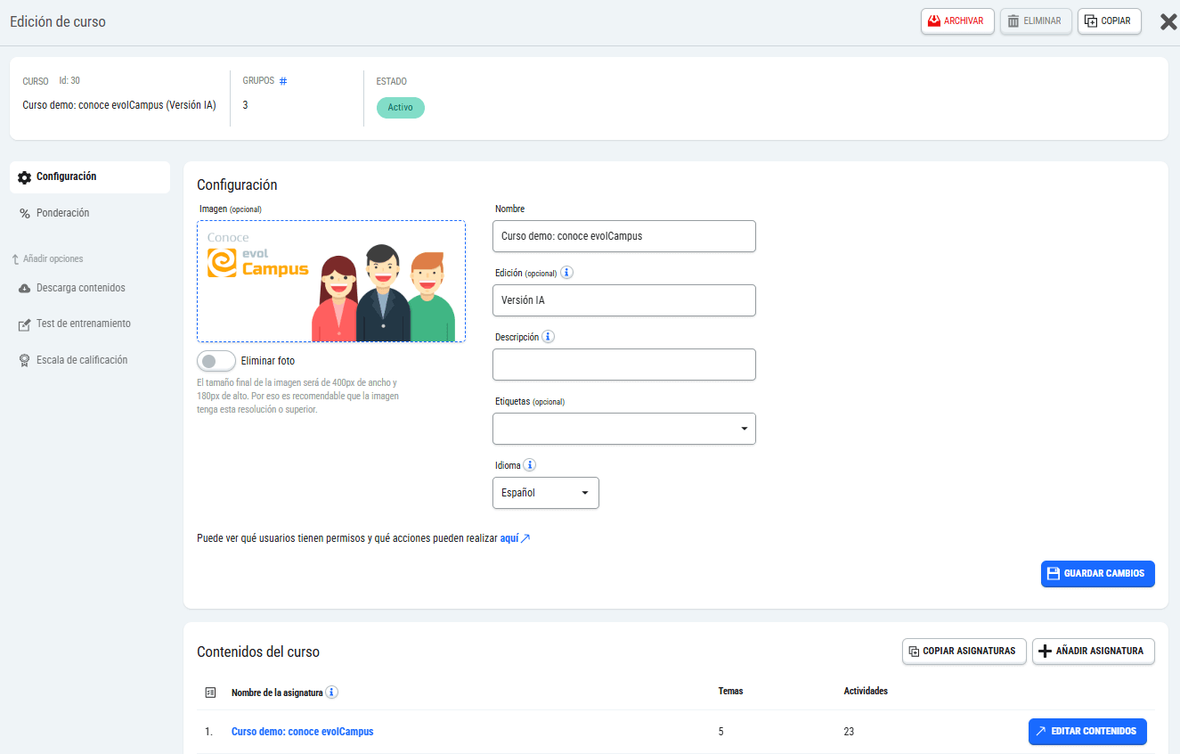 Una vez creado el nuevo curso, entraremos en la pantalla de edición, donde podremos editar el nombre, la edición, el idioma y la imagen que el alumno verá en su campus.