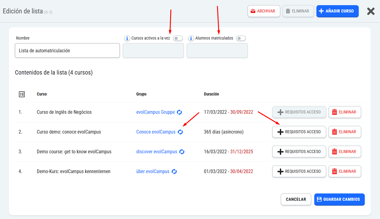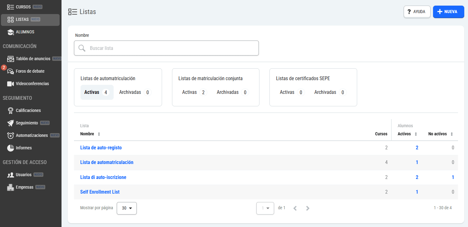 Las listas son conjuntos de cursos que podemos crear para gestionar con más facilidad el acceso de los alumnos.