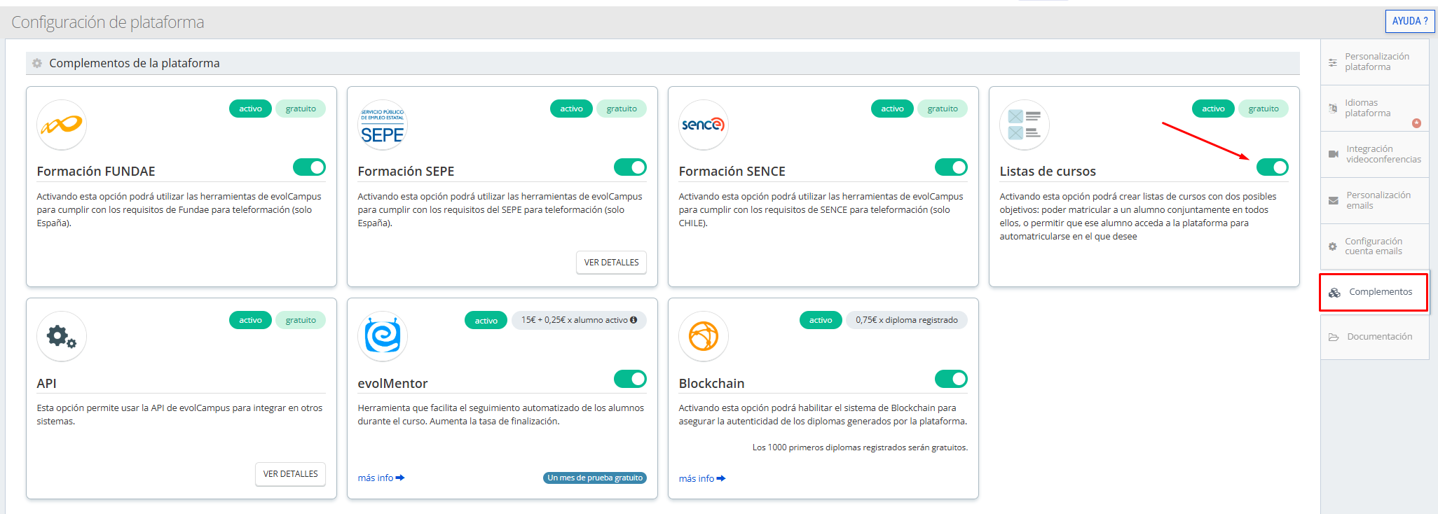Para tenerlas disponibles en el menú de cursos hay que activar "listas de cursos" en el menú de Configuración => Complementos: