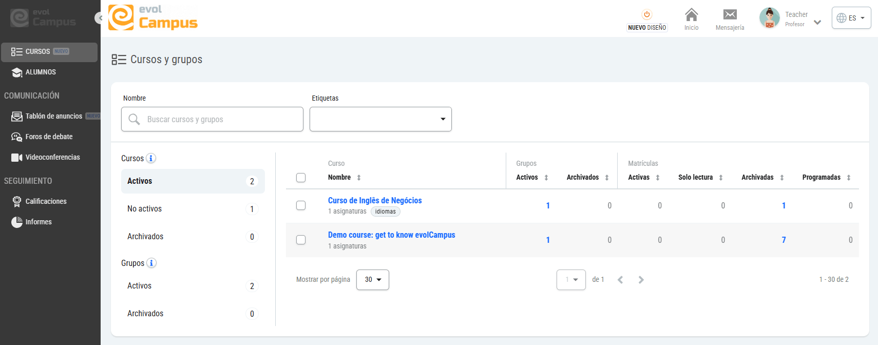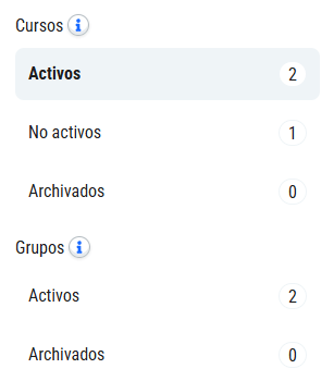 - No activos: cursos que no tienen ningún grupo, o que tienen todos sus grupos archivados.
