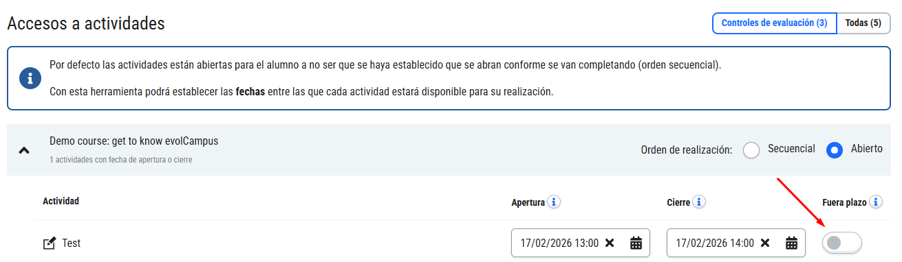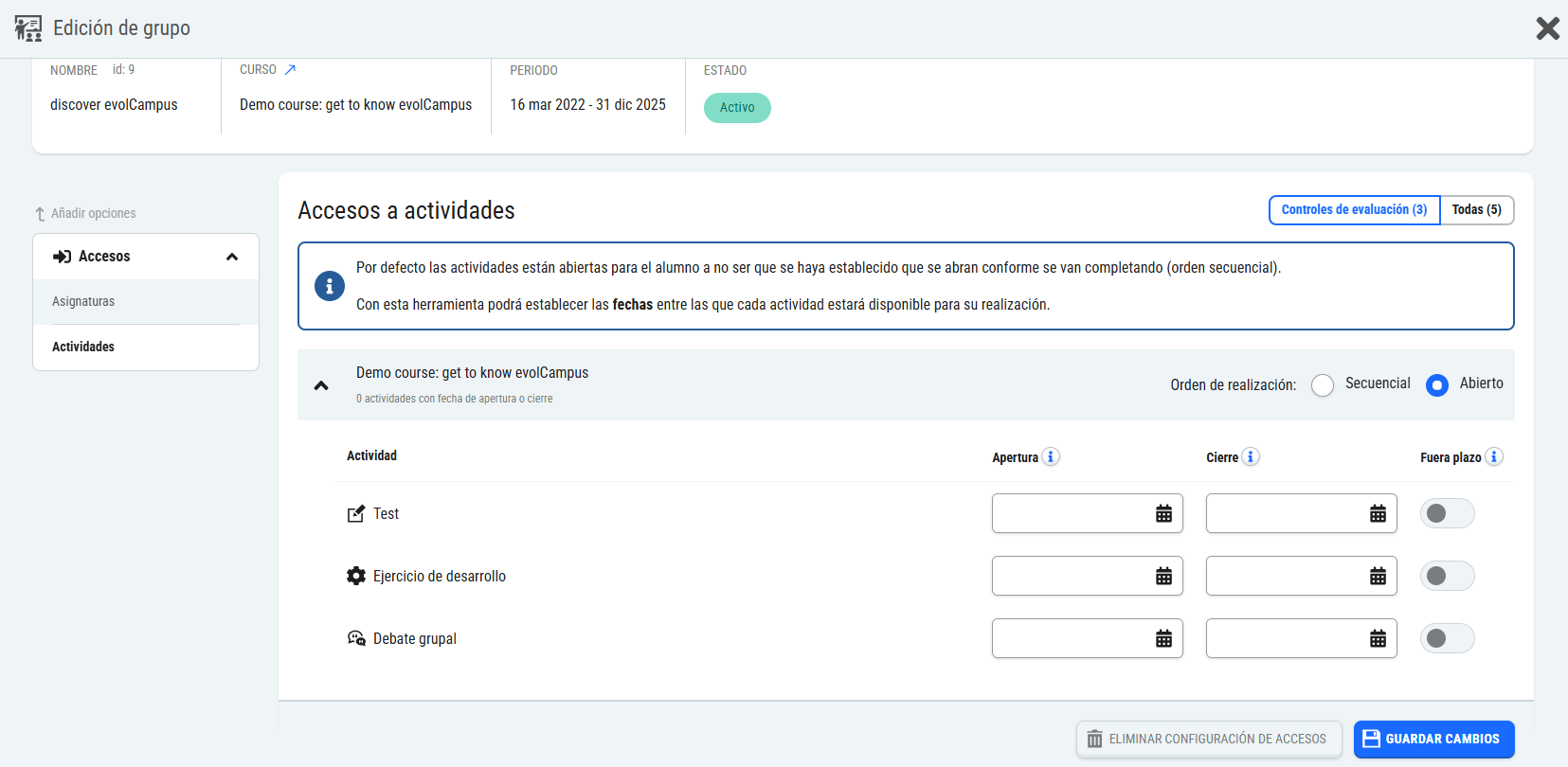 Acceso a actividades: podrá configurar una fecha de apertura de la actividad, de forma que esté bloqueada hasta dicha fecha, y una fecha límite de realización, para los controles de evaluación (actividades que generan nota). Esta programación de acceso de actividades solo es configurable en grupos síncronos.