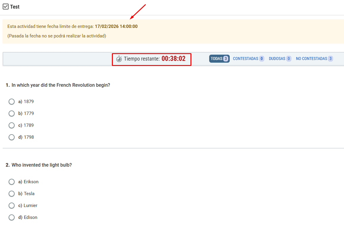- Para los accesos de actividades tipo test podemos indicar fecha con hora de inicio y fin. Si lo activamos como vemos en la captura, sin la posibilidad de entregar fuera de plazo, el alumno podrá entrar a realizar el test si accede en el día y hora de inicio, y una vez esté realizando el test y le queden menos de 3 horas para fecha y hora fin, le aparecerá un contador de manera informativa para que pueda entregar la actividad dentro del plazo configurado.