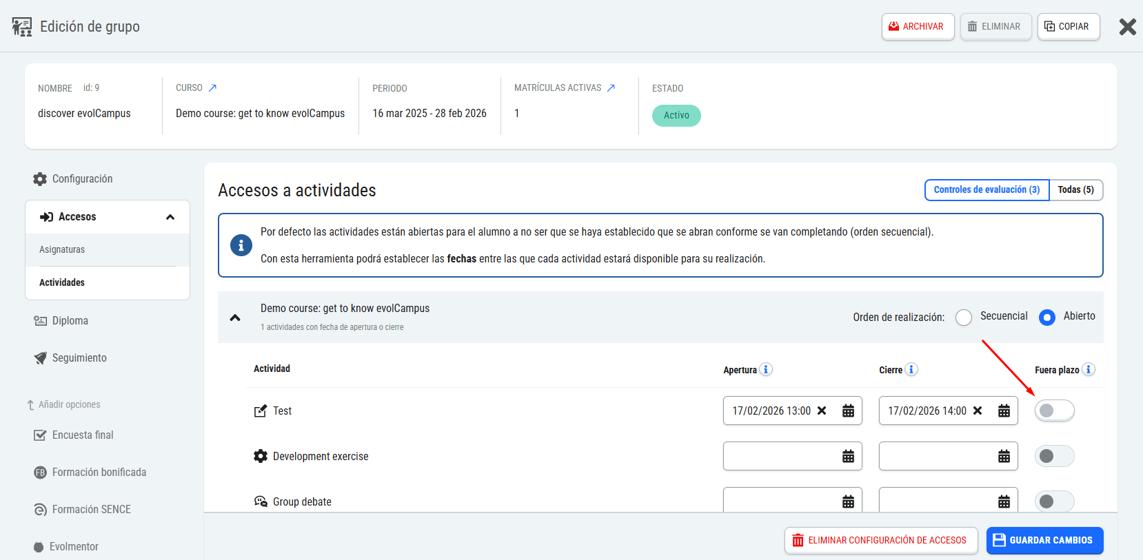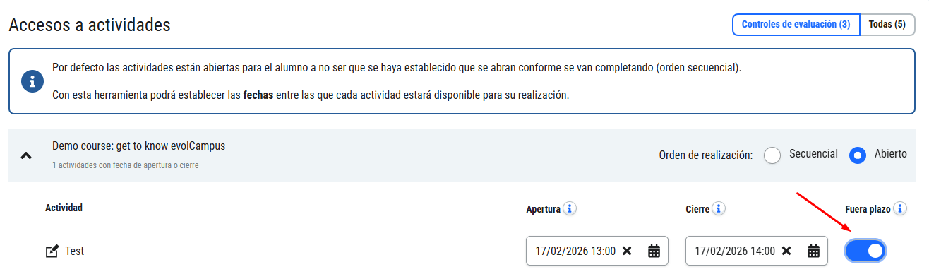 - Acceso a actividades: podrá configurar una fecha de apertura de la actividad, de forma que esté bloqueada hasta dicha fecha, y una fecha límite de realización, para los controles de evaluación (actividades que generan nota). Esta programación de acceso de actividades sólo es configurable en grupos síncronos.