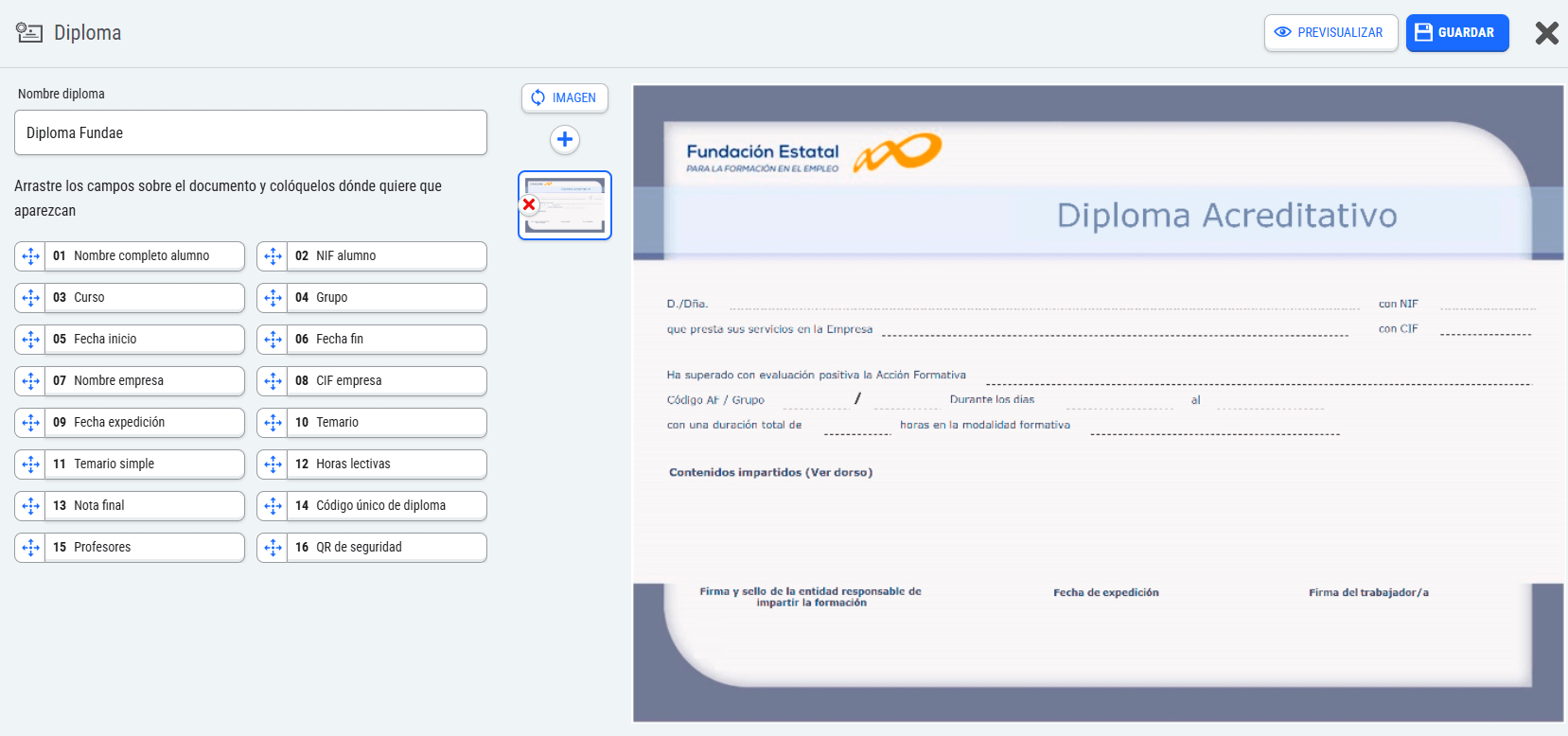 A la derecha del diploma tiene los campos, procedentes de la base de datos, que puede añadir al diploma y que en el diploma definitivo se sustituirán por los datos correspondientes.