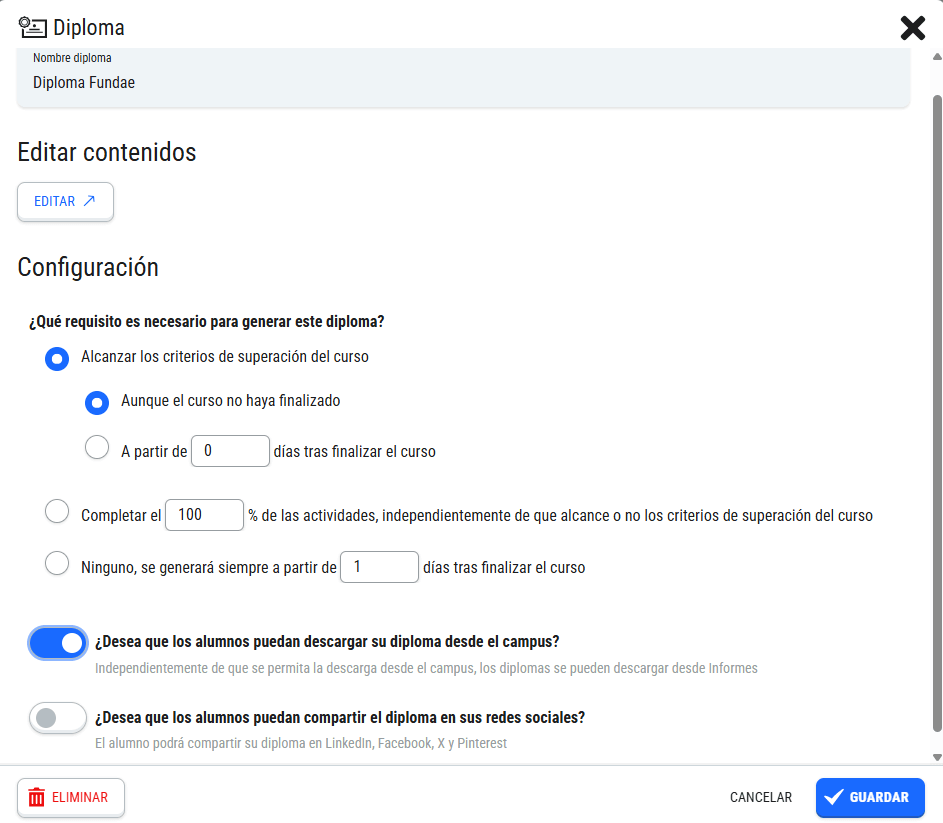 Esta pantalla nos permite crear uno o varios diplomas para los alumnos de este grupo, y configurar si el alumno podrá descargarlo desde su campus y compartirlo en sus Redes Sociales.
