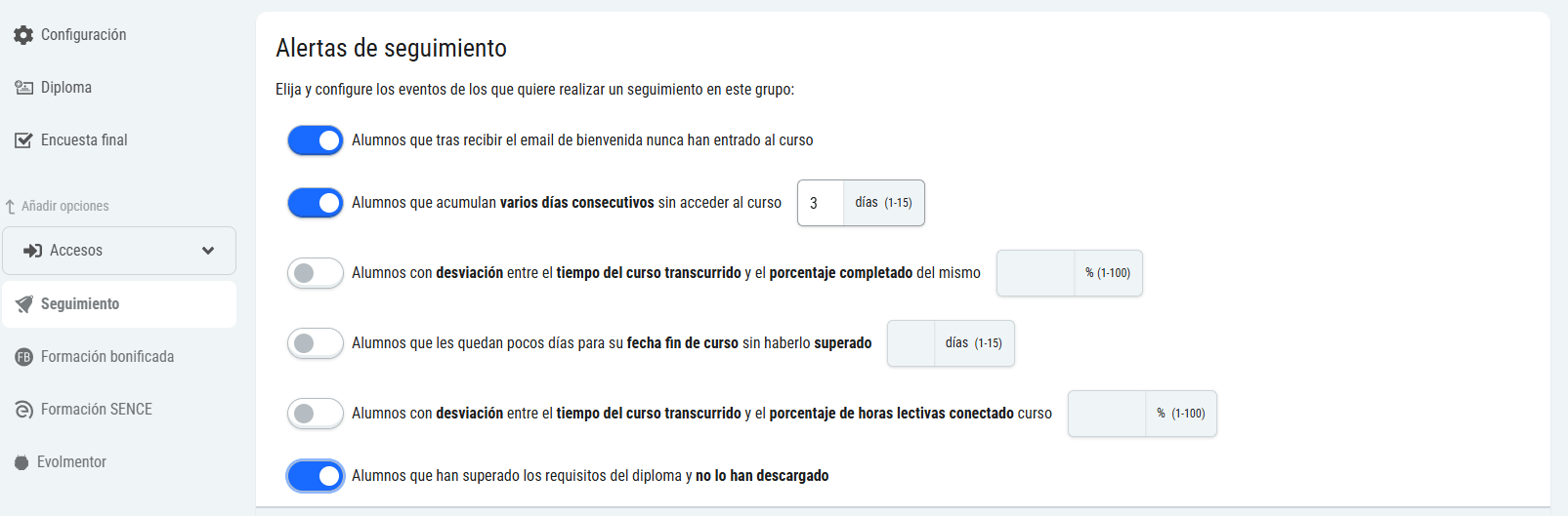 Podremos configurar para cada grupo alertas como que nos avise de los alumnos que no han entrado nunca al curso, los que llevan varios días consecutivos sin acceder al curso, que llevan retraso (menor porcentaje de curso completado que porcentaje de curso transcurrido), etc. En el siguiente enlace explicamos con mayor detalle cómo configurar estas alertas.