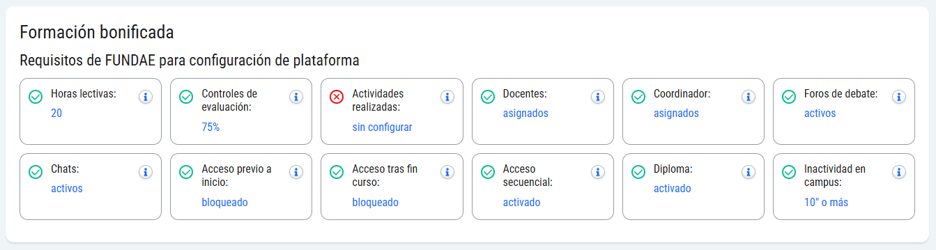 Una vez que creamos la acción formativa, evolCampus nos mostrará en rojo y verde los requisitos que estamos cumpliendo según las orientaciones de FUNDAE, como guía para ayudar a configurar el grupo.