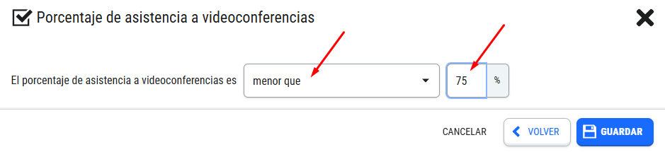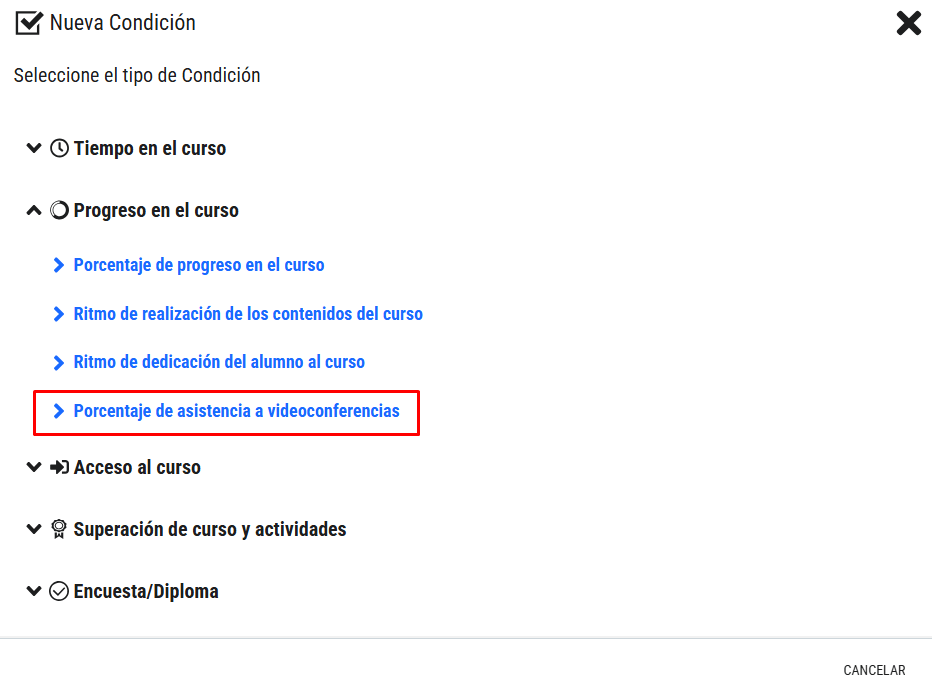Dentro de la condición "Progreso en el curso" tenemos una nueva opción: "Porcentaje de asistencia a videoconferencias":