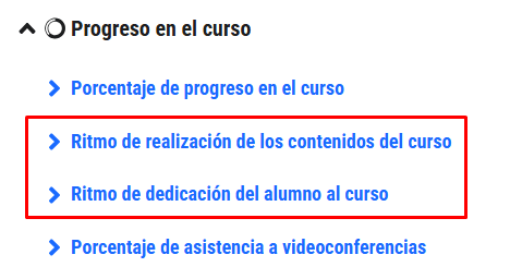 Por otra parte, dentro de este apartado veréis que hemos reformulado dos de sus condiciones para facilitar su comprensión. La funcionalidad en sí no ha cambiado, únicamente se ha mejorado la claridad en los textos. Os invitamos a que las utilicéis para hacer seguimiento de la dedicación del alumno al curso y de su ritmo de realización: