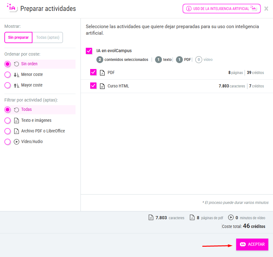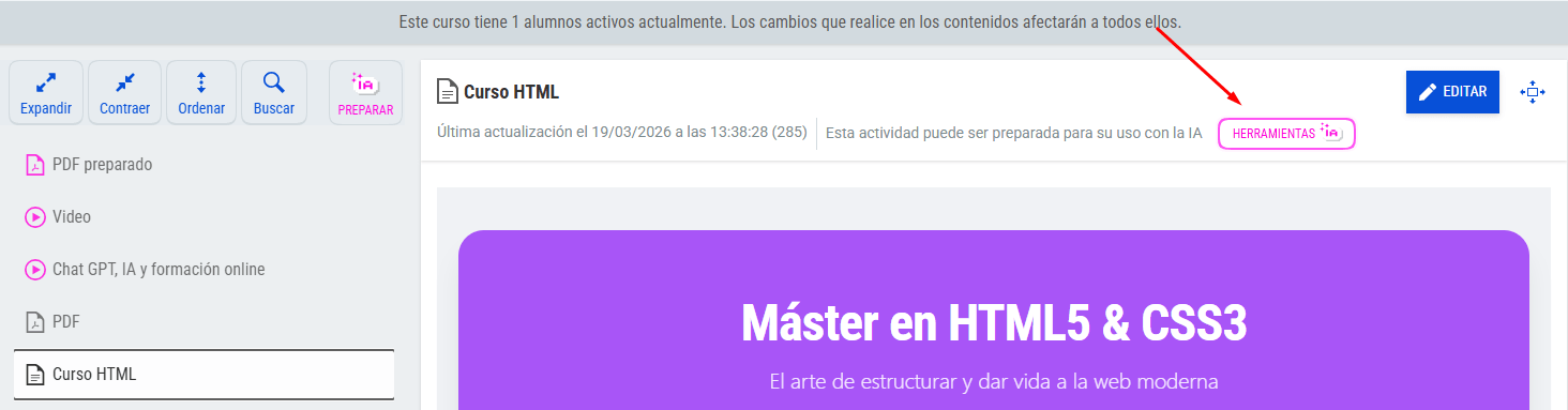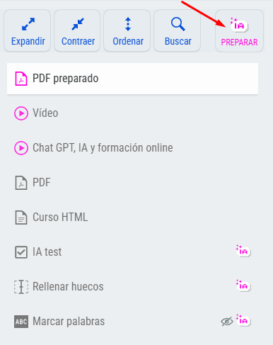 Hay dos maneras en que se pueden de preparar las actividades: cuando se crean extensiones de los contenidos con IA las actividades se preparan al mismo tiempo, o de manera masiva desde el botón que encontraréis en la parte superior derecha en el listado de actividades. Esto último es especialmente útil si se quiere que los alumnos puedan realizar preguntas sobre todos los contenidos del curso, o para seleccionar alguno en concreto.