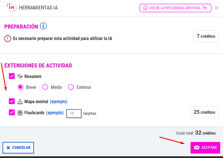 - Extender contenidos: a partir de vuestros textos, PDFs y vídeos podréis ampliarlos y mejorarlos creando nuevos formatos como son los mapas mentales, los resúmenes o la creación de flashcards. Solo hay que hacer clic en "Herramientas IA" en la actividad y elegir cómo quieres enriquecer tus contenidos.