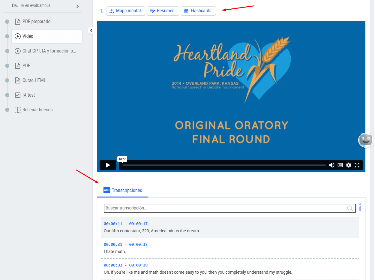 - Generar automáticamente su transcripción: el alumno podrá seguir el vídeo en texto y también buscar por alguna palabra o término para ir directamente a esa parte del vídeo.