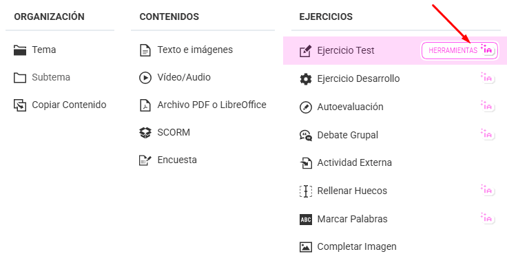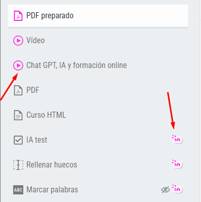 Podréis identificar los ejercicios generados con la marca IA o el color rosa de actividades donde habéis creado contenido extra (no visible para los alumnos).
