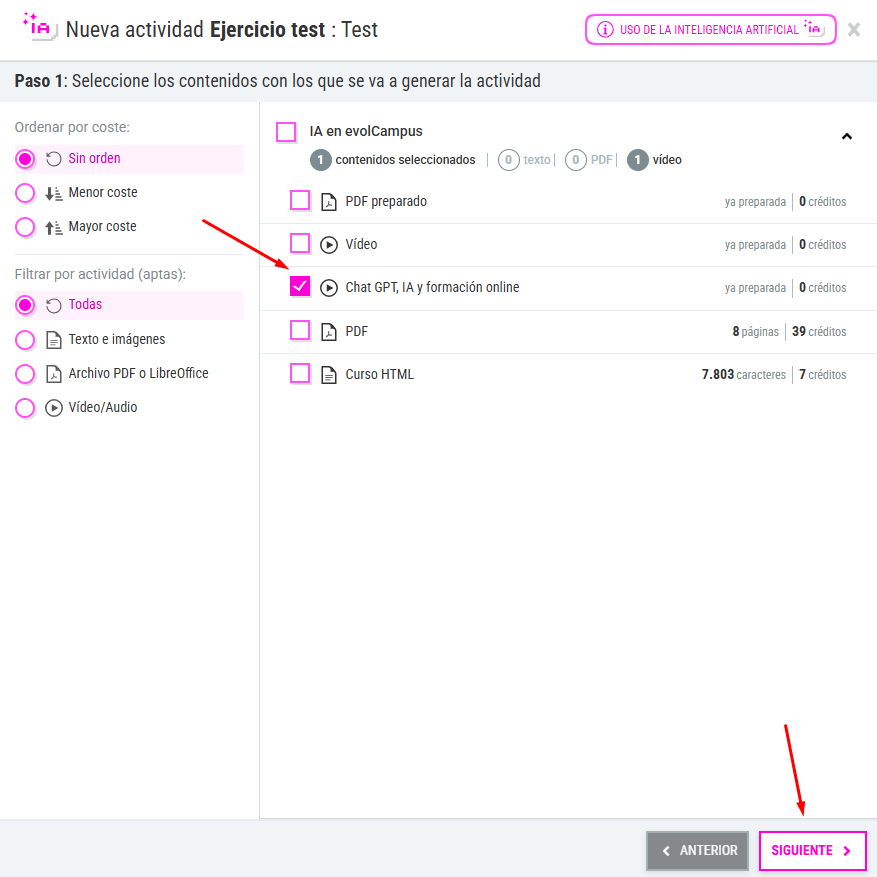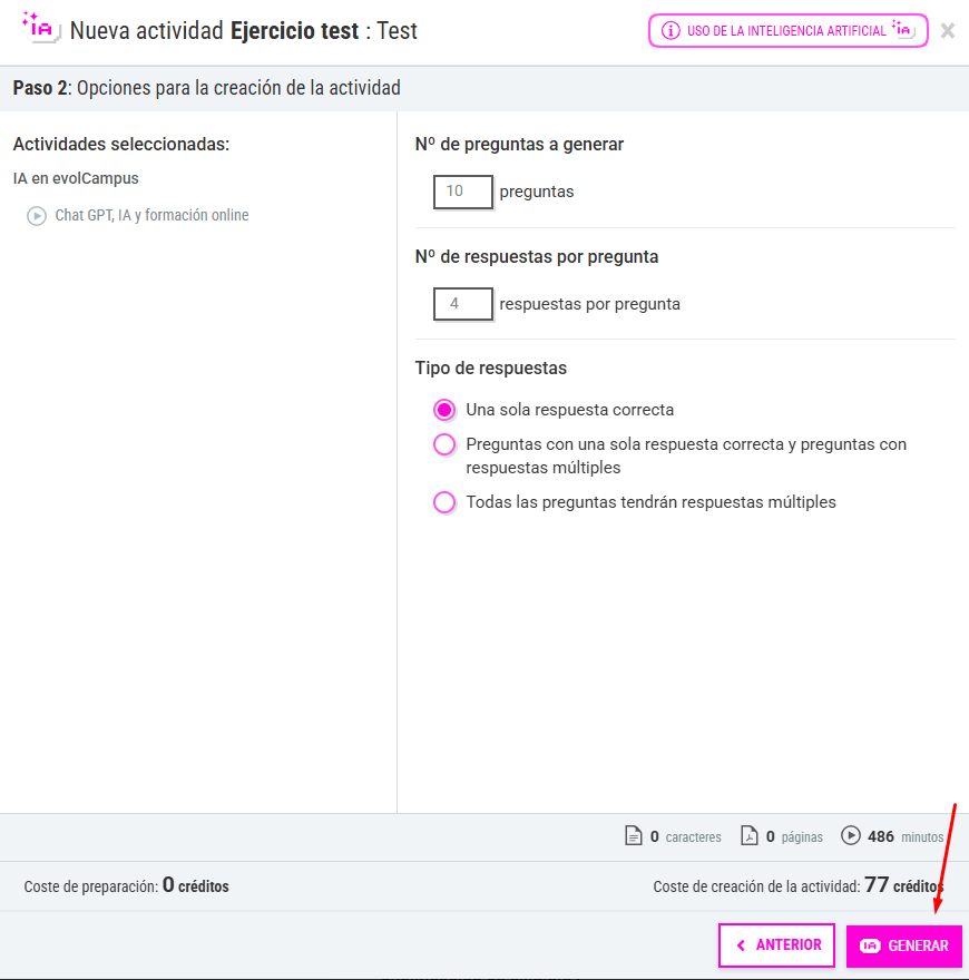 - Creación de nuevos ejercicios: creación de ejercicios a través de la IA a partir de uno o más de los contenidos que hay en el curso eligiendo las opciones que se desee para generar preguntas.