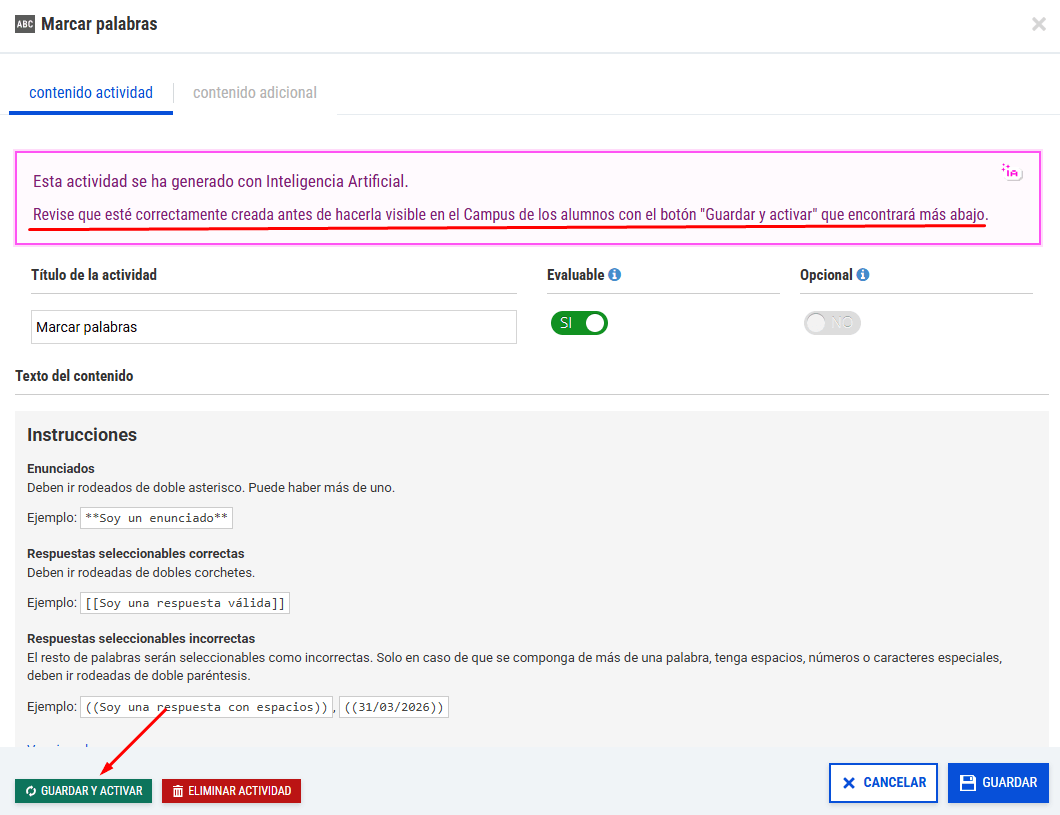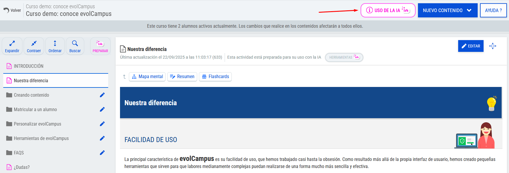 - Cuándo no se puede utilizar la IA: en actividades donde la IA no puede acceder (SCORMs, vídeos alojados en cuentas externas, PDFs protegidos, actividades con textos muy breves).