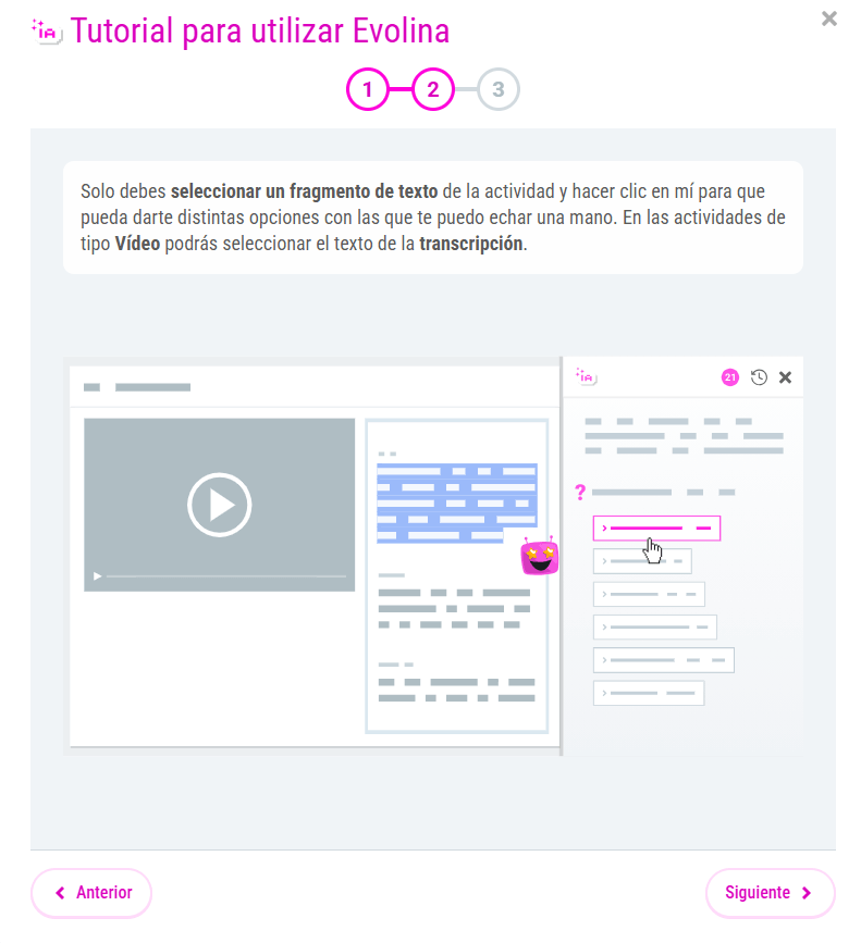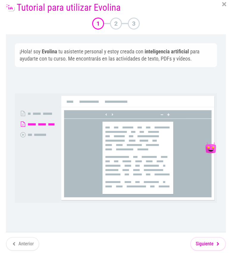Al acceder al curso, al alumno le aparecerá un asistente y un breve tutorial donde le explica cómo puede ayudarle.