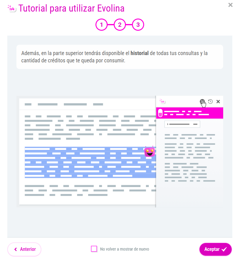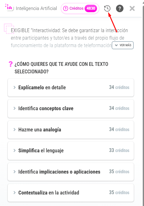 El alumno solo tendrá que seleccionar la parte del texto que le presenta alguna duda, para que se active el asistente de inteligencia artificial. Al pulsar sobre él, le mostrará las acciones que tiene disponibles para ayudarle con el párrafo seleccionado. Además, podrá consultar el historial de consultas realizadas: