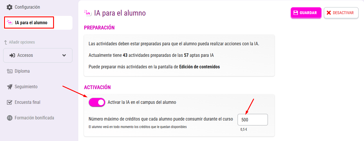 El precio de la IA será por consumo, ya sea a nivel de gestión o campus, es decir, no va a tener un coste fijo añadido. El coste de créditos se verá reflejado antes de ejecutar cualquier acción por lo que tendréis presente en todo momento la cantidad que os va a suponer, lo que significa una gran ventaja a la hora de llevar un control del gasto.