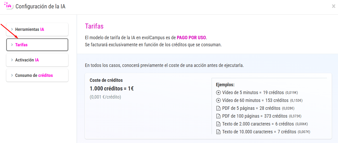 Los créditos son el modo en que vamos a contabilizar las acciones que realicemos, ya que son necesarios para realizar cualquier acción con la IA. 1000 créditos corresponden a 1 euro.