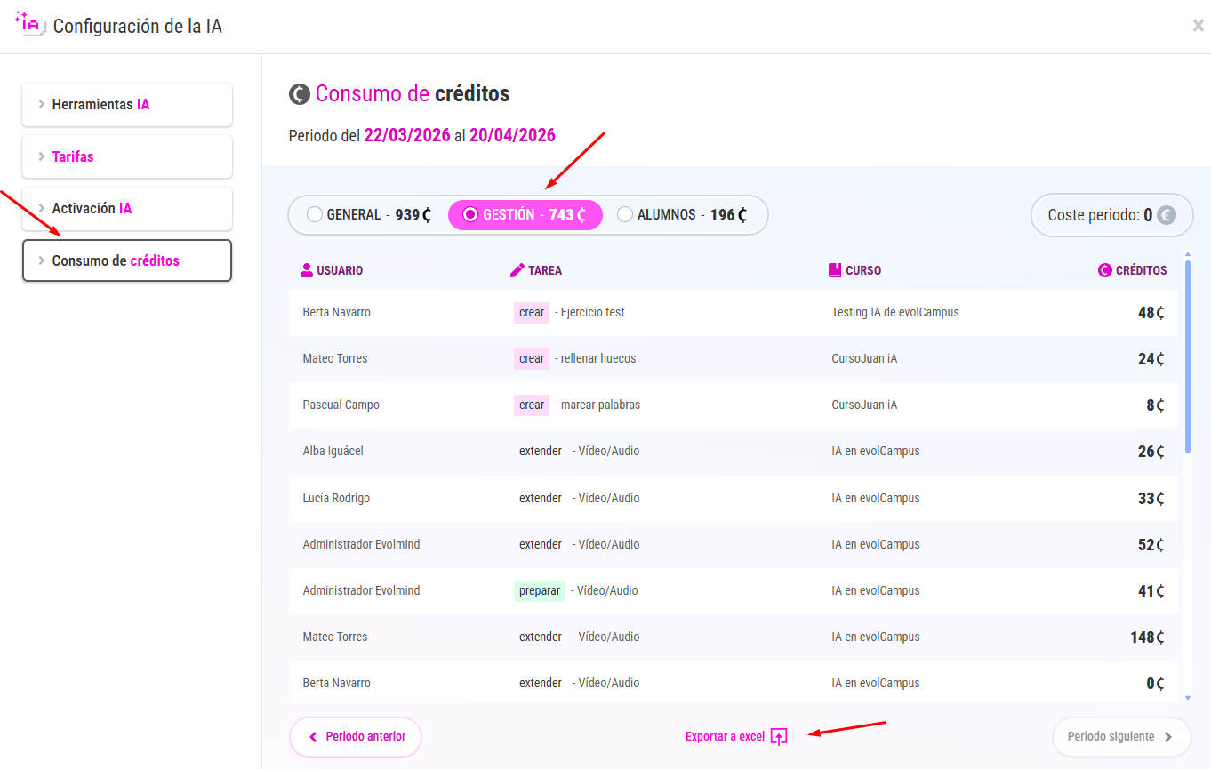 En la pantalla de consumo de créditos también podréis llevar un control del desglose de los costes, tanto a nivel de gestión como por parte de los alumnos. Tendréis el detalle por usuario, tarea y curso y el número de consultas realizadas por los alumnos, así como la posibilidad de exportar la información.