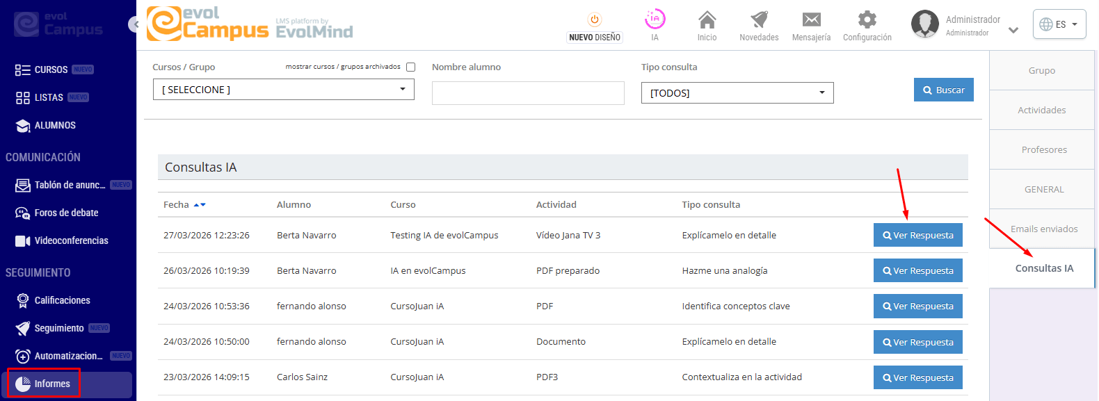 Por último, si tenéis curiosidad, queréis hacer seguimiento o estar seguros de que las respuestas que la IA ofrece se ajustan a los contenidos de vuestros cursos, tenéis disponibles todas las consultas que los alumnos realizan en un nuevo informe.