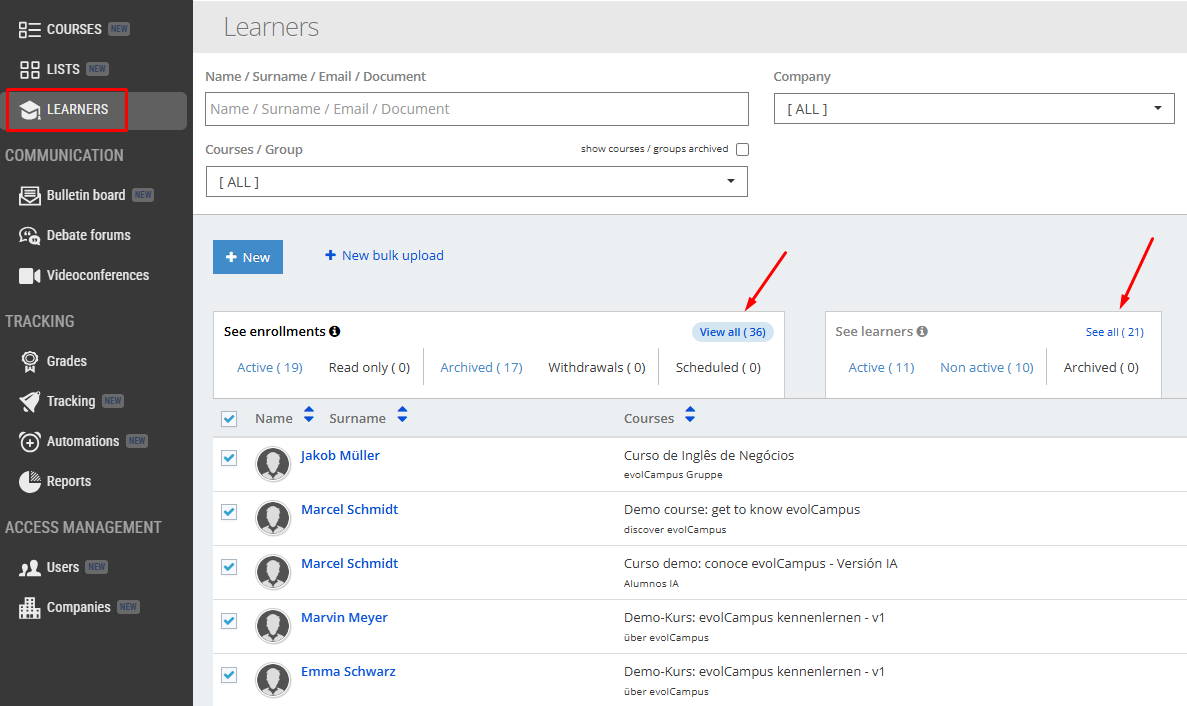 We would also like to take this opportunity to inform you about a new field available in the “Learners” section of the platform, which will allow you to view all students and enrollments you have registered, regardless of their status (active, archived, etc.).
