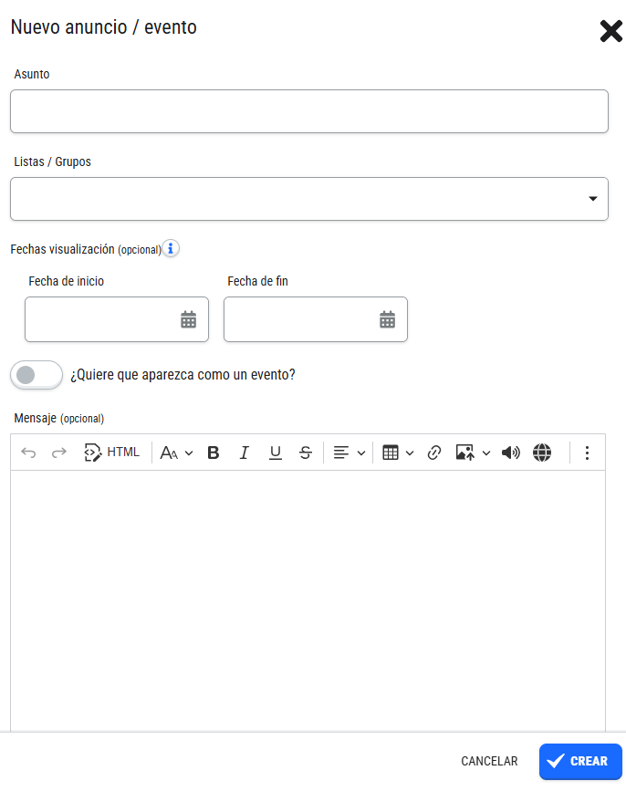Al crear el anuncio, elegiremos a quién va dirigido el mensaje, el asunto, el texto y la fecha de visualización, que es el rango de fechas entre las que el anuncio estará activo y visible para los alumnos.