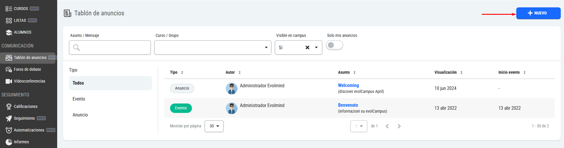 Los alumnos en vez de verlo como mensaje dentro del tablón de anuncios, lo verán en la sección 'Agenda' y en el calendario dentro de su campus.